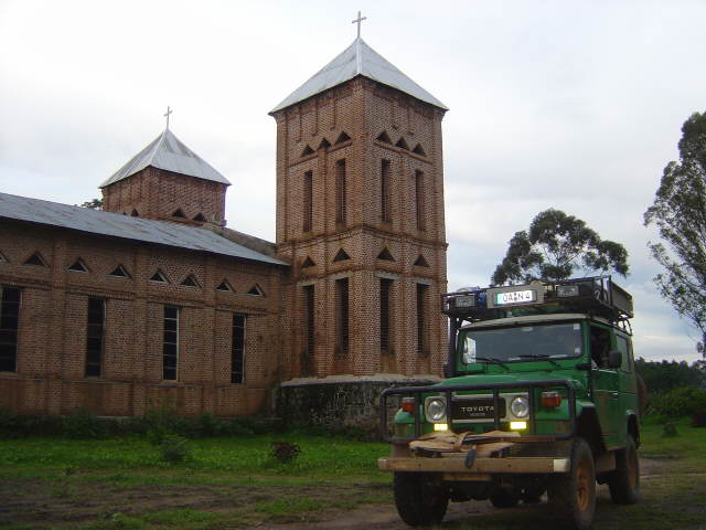 Wir rumpeln los über eine nasse Piste und sind aber voll begeistert von der Landschaft. Sanfte Hügel, Wald und Felder, Dörfer und Einsamkeit wechseln ständig ab. Fast in jedem größerem Dorf haben wir Handyempfang und wir kommen trotz der widrigen Straßenverhältnisse zügig voran. Immer wieder kommen Abschnitte auf der Piste, die wir Autobahn nennen; frisch geschobene breite Pistenabschnitte, welche aber immer wieder in wirklich tief zerfurchte Abschnitte enden und mehr wie einmal schalten wir den 4x4 ein, um nicht in den tiefen Schlammlöchern stecken zu bleiben. Mitten im Wald, in Matai treffen wir auf eine riesige Backstein-Kirche, und als wir stehen bleiben, um uns das Bauwerk mal näher anzusehen, erfahren wir, das sie von den Deutschen erbaut wurde. Hier mal eine kleine Rüge an unseren Geschichtsunterricht in der Schule. Hat irgend jemand schon mal was von 'Deutsch-Ost-Afrika' in der Schule gehört? Naja, vielleicht war ich ja krank an diesem Tag. Wir müssen uns in der Schule mit der unwichtigen Hirarchie der griechischen Götter auseinandersetzen, und über deutsche Kolonial-Politik bekommt man nichts (oder wenig) gesagt. Inspiriert von diesem Bauwerk kommen wir in dieser Nacht wieder mal in einer Mission unter.