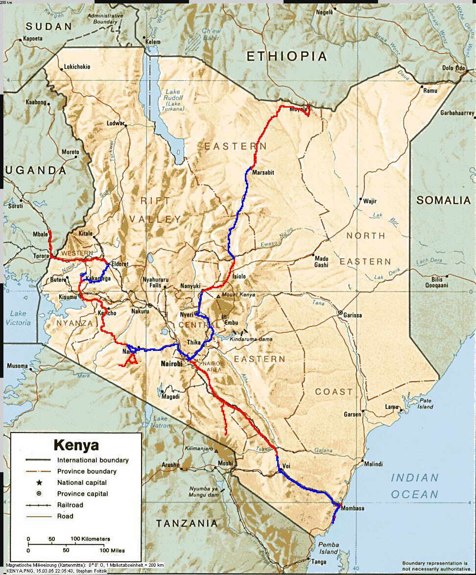 Die Grenze (N 0°38.242', O 34°16.111') zu KENYA macht keinen so professionellen Eindruck wie die von UGANDA, aber trotzdem geht es korrekt zu. Visa kosten 50$ pP, Fahrzeugsteuer sind nochmal 40$ für Kfz über 2000ccm pro Monat.