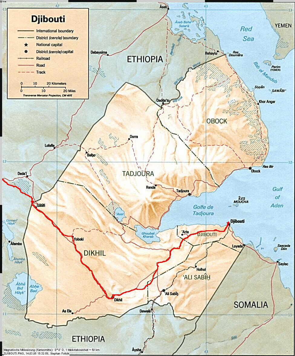 Die Einreise (N 11°43.024', O 41°50.228') ist leider nicht mit vorhin zu vergleichen. Wir sind wieder in einem Franzockenland. Unhöflich und mit viel Rennerei müssen wir die einzelnen Stationen durchlaufen. Es geht aber alles korrekt zu und bald haben wir die Grenze hinter uns gelassne.